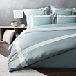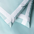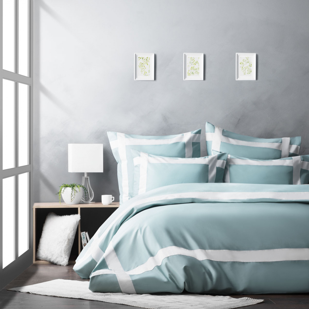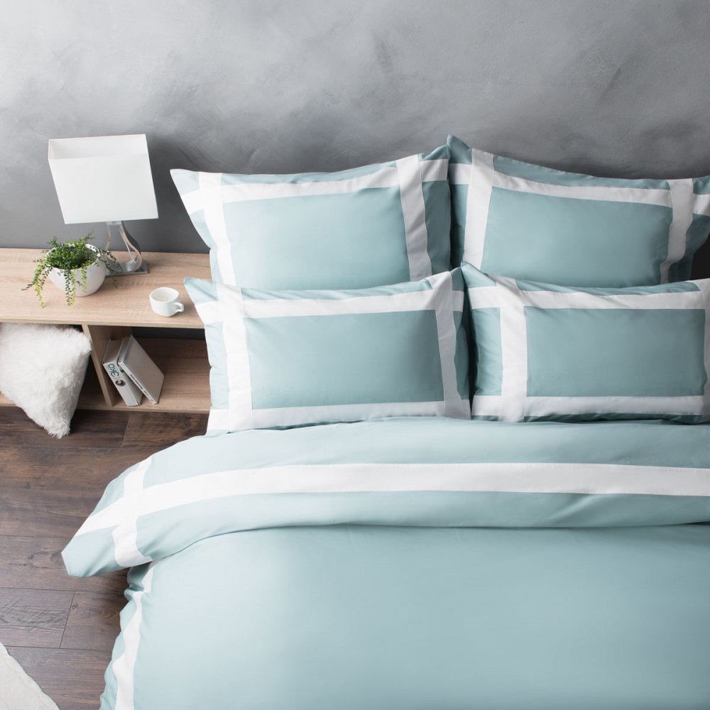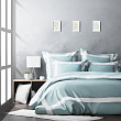 Комплект постельного белья из сатина с отделкой контрастными планками. В комплект входят 2 наволочки, пододеяльник и простынь. Состав - 100% Хлопок.