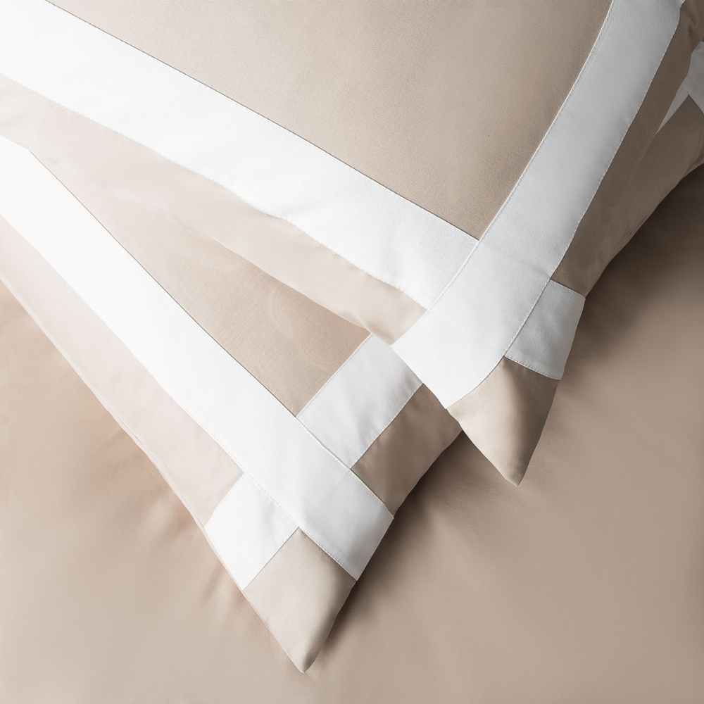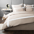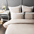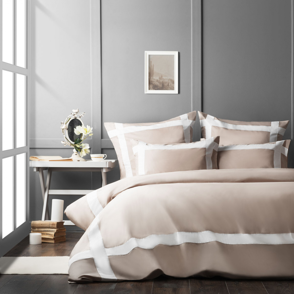 Комплект постельного белья из сатина с отделкой контрастными планками. В комплект входят 2 наволочки, пододеяльник и простынь. Состав - 100% Хлопок.