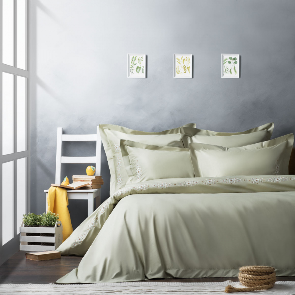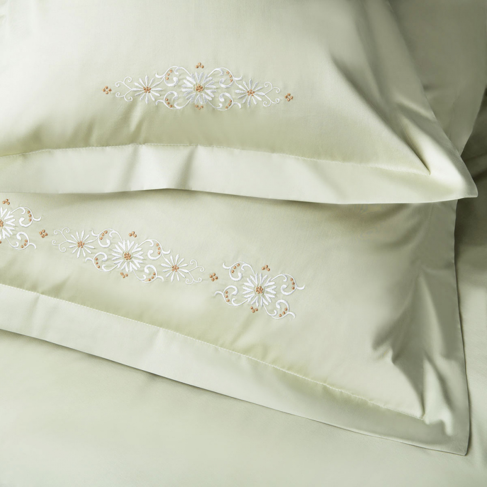 Комплект постельного белья из сатина с контрастной вышивкой. В комплект входят 2 наволочки, пододеяльник и простынь. Состав - 100% Хлопок.