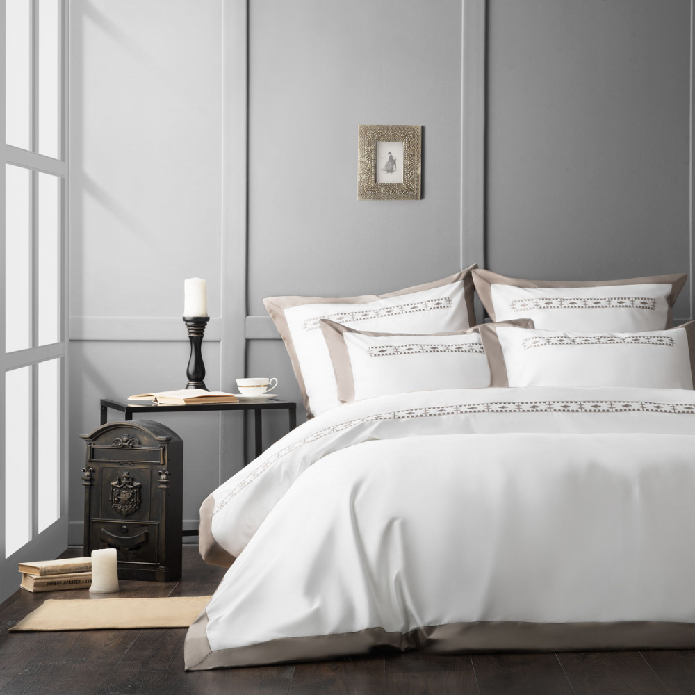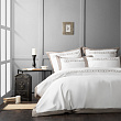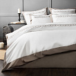 Комплект постельного белья из премиального сатина высокой плотности с отделкой контрастными планками и вышивкой. В комплект входят 2 наволочки, пододеяльник и простынь. Состав - 100% Хлопок.