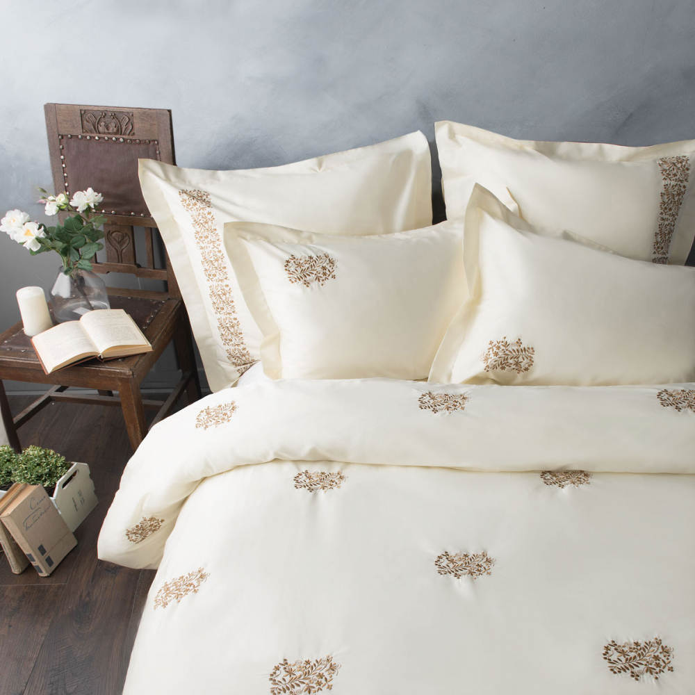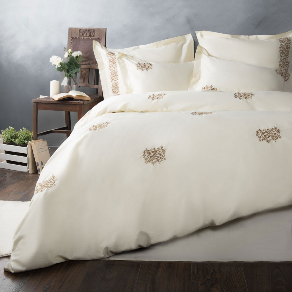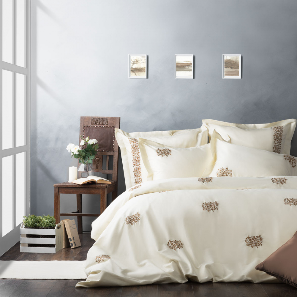 Комплект постельного белья из сатина с контрастной вышивкой. В комплект входят 2 наволочки, пододеяльник и простынь. Состав - 100% Хлопок.