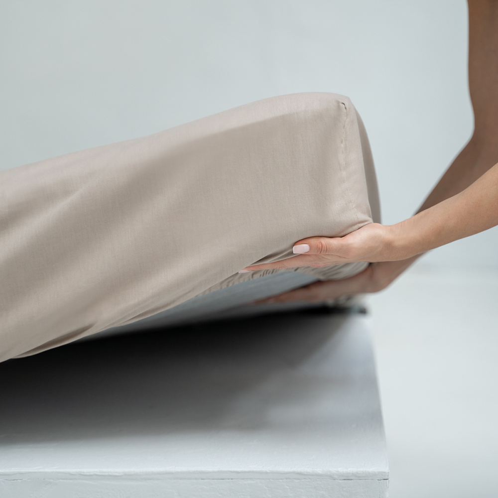 Простыня на резинке из натуральной однотонной ткани. Материал ткани - ранфорс, состав - 100% хлопок, плотность ткани - 115 г/м2.